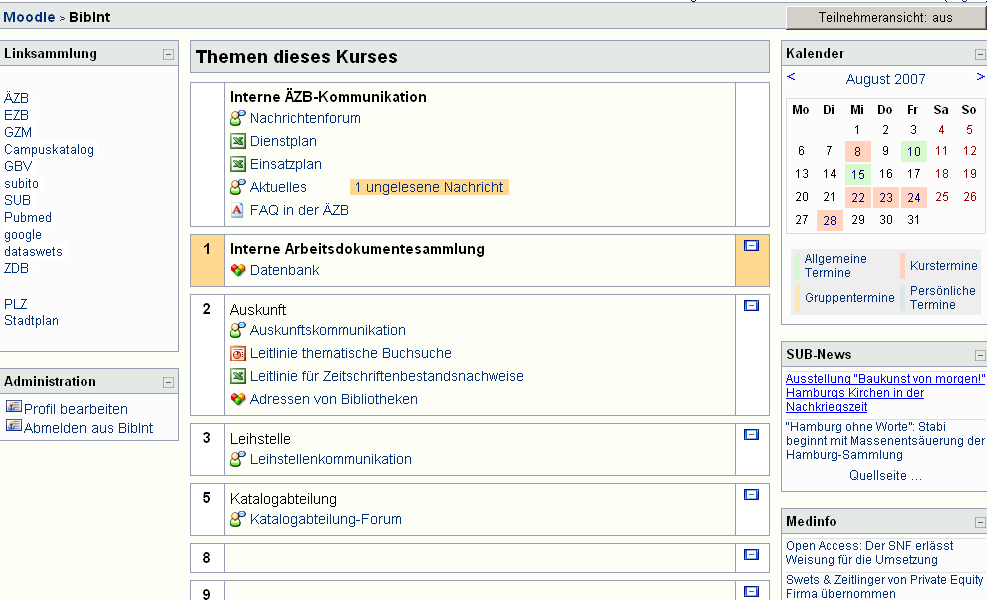 Ein weiterer Gewinn aus der Mitarbeit von ÄZB-Mitarbeitern an dem UKE-E-Learning-Projekt ist ein Spezial- und Detailwissen in der Anwendung der LMS-Software Moodle. Übertragen auf die tägliche Bibliotheksarbeit resultierte daraus das E-Learning-Modul: Interne ÄZB-Kommunikationsplattform. Diese beinhaltet eine neue Startseite für Mitarbeiter und Studenten, die zentral verschiedene Werkzeuge bereitstellt, um den internen Informationsfluss und die tägliche Bibliotheksarbeit zu unterstützen.