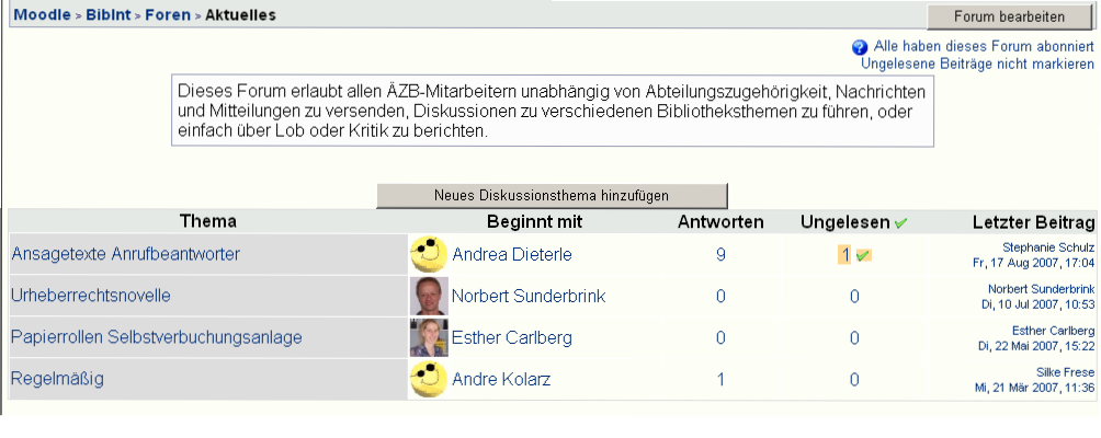 Bei der Realisierung des Moodle-Moduls ÄZB-Kommunikationsplattform lag der Schwerpunkt auf der Einrichtung einer Seite, die alle zur täglichen Bibliotheksarbeit nötigen Links, Werkzeuge und Dokumente enthält oder darauf verweist. Diese sollte als Startseite auf jedem Mitarbeiter-PC integriert sein und ein zentraler Ausgangspunkt für jede Art von Recherche und Kommunikation innerhalb der Bibliothek werden. Den besonderen Mehrwert eines E-Learning-Moduls, interaktive Einheiten bereitzustellen, wurde genutzt, um die Mitarbeiter in einen kontinuierlichen Aufbau der Inhalte einzubeziehen. Jeder Mitarbeiter hat nun die Möglichkeit eigene Datenbankeinträge zu erstellen oder die seiner Kollegen zu kommentieren. Gefragt ist auch die Mitarbeit bei der Weiterführung der FAQs und beim inhaltlichen Aufbau der abteilungsspezifischen Bereiche. Dieses Modul lebt und wächst durch die Nutzung der zur Verfügung gestellten Werkzeuge.