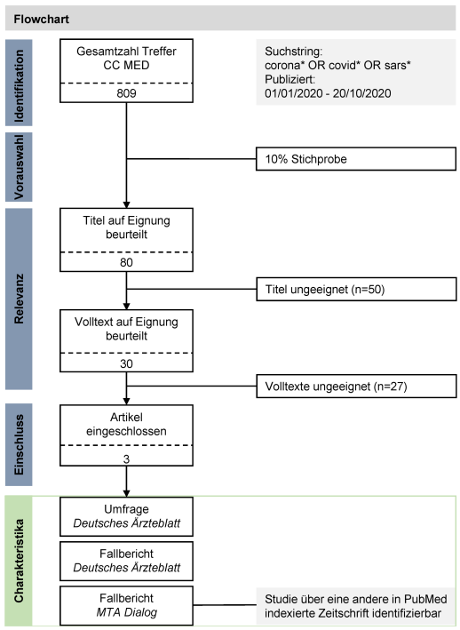 Methodik: Mittels einer systematischen Suche identifizierten wir alle von Januar bis Oktober 2020 in CC MED vorhandenen Artikel zu COVID-19 und untersuchten eine 10% Stichprobe. Die Ein- und Ausschlusskriterien folgten den Vorgaben zur Inklusion wissenschaftlicher Publikationen in das CCSR.