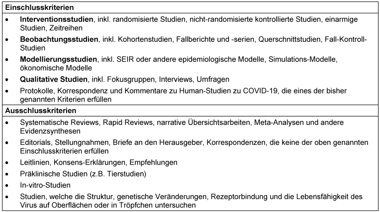 Tabelle 1: Ein- und Ausschlusskriterien der Studienselektion für das Cochrane COVID-19-Studienregister