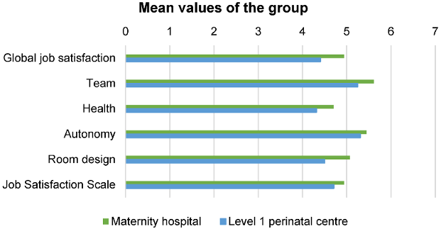 There was a statistically significant difference in global job satisfaction (t(243)=–3.00, p=0.03), with midwives in maternity hospitals being more satisfied (M=4.91, SD=1.33) than midwives in level one hospitals (M=4.41, SD=1.40). They more frequently reported (t(243)=–3.56, p<0.001) having sufficient time to properly look after the women in their care (M=4.34, SD=1.61) than the midwives in the level one perinatal centres (M=3.53, SD=1.60). The satisfaction with the team (level one: M=5.25, SD=1.14 maternity hospitals: M=5.61, SD=1.09) was also higher in this group (t(243)=–2.54, p=0.01). There was no statistically significant difference when it came to autonomy and state of health. The midwives in the maternity hospitals were significantly more satisfied, especially with the design of the birthing room (t(242)=–3.35, p<0.001). The midwives from the level one hospitals had slightly less professional experience and were younger (professional experience: level one: M=13.19, SD=11.02, maternity hospitals: M=16.03, SD=11.14, p=0.051; age: level one: M=36.21, SD=10.73; maternity hospitals: M=39.53, SD=11.23, p=0.021).
