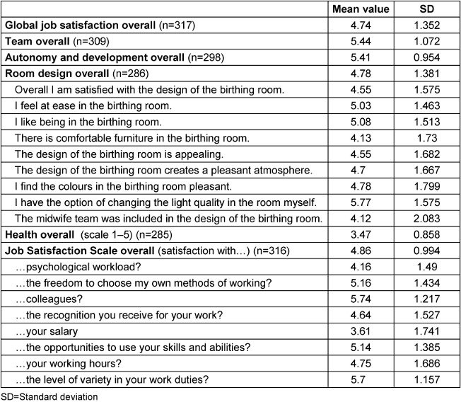 Based on the mean values of the scales, satisfaction with the team scored highest (5.44) and room design scored lowest (4.78). In the analysis of the individual items, satisfaction with salary and the time available to properly care for the women showed the lowest values (3.61 and 3.99, respectively), while the items “team members help one another” and “I have the skills I need to work in the birthing room” had the highest satisfaction scores, each with a mean value of 6.11.