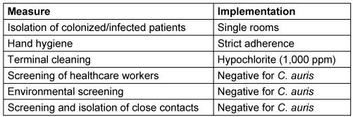 The following measures were implemented: standard precautions including hand hygiene were strictly adhered to and all infected patients with C. auris were isolated in a single room, with the room terminally cleaned after discharge using a hypochlorite solution at 1,000 ppm of available chlorine (i.e., a concentration higher than that routinely used).