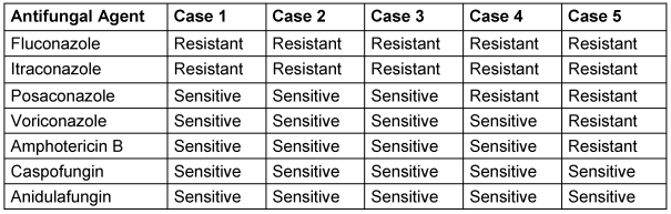 Susceptibility to fluconazole, itraconazole, posaconazole, voriconazole, amphotericin B, caspofungin, and anidulafungin was tested using the broth microdilution method.