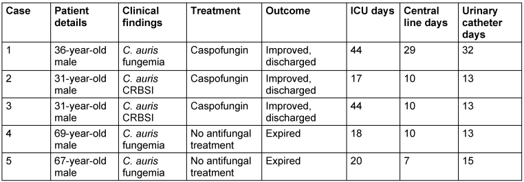 Case series: We present a case series of five ICU patients with fungemia caused by C. auris. The cases emphasize the immune status, screening, and clinical manifestations of these patients. Antifungal susceptibility testing using broth microdilution was performed, and antifungals were administered based on sensitivity reports. Three patients showed improvement with appropriate therapy.