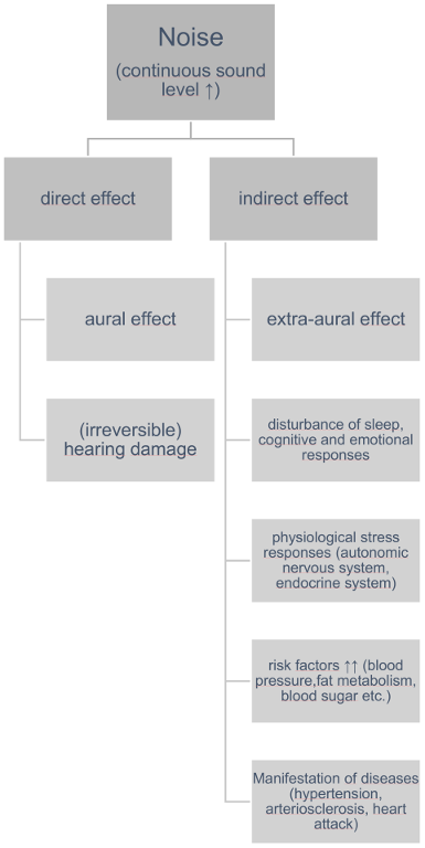 In principle, noise effects can be distinguished between those that directly affect the auditory system (aural effects), and those that impact the rest of the organism (extra-aural effects). Aural noise effects with mostly irreversible damage to the inner ear occur for instance after a single very intense noise exposure (blast trauma, >140 dB) or after years of regular noise exposure (>85 dB). These long-term noise exposures are found particularly among individuals who are occupationally exposed to noise. Thus, they fall under the category of occupational health-relevant exposures. In the context of environmental physics, the effect of sound is “indirectly” mediated. It can be assumed that the majority of extra-aural disorders are caused by an unspecific activation of the autonomic nervous system and certain endocrine responses (Figure 1 [Fig. 1]).