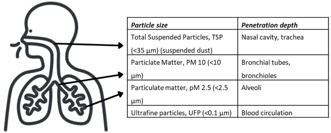 Particles with an aerodynamic diameter smaller than 35 µm are referred to as suspended particulate matter (total suspended particles, TSP). Due to the property of suspended particulate matter to “float in the air”, it can easily enter the lungs with the air we breathe. Particles with a size (diameter) over 10 µm remain mainly in the upper airways of the nasopharynx and the trachea. The mucous membrane of the upper airways is capable of eliminating these particles. Particles with a diameter less than 10 µm (particulate matter, PM10) penetrate deeper into the respiratory tract, reaching the bronchi and bronchioles. They are therefore referred to as inhalable airborne dust or thoracic dust. An even smaller diameter of less than 2.5 µm (particulate matter, PM2.5) allows particles to reach the alveoli. The ultrafine particles (UFP) are even smaller (<0.1 µm). These are not completely retained in the alveoli, but can reach the bloodstream.