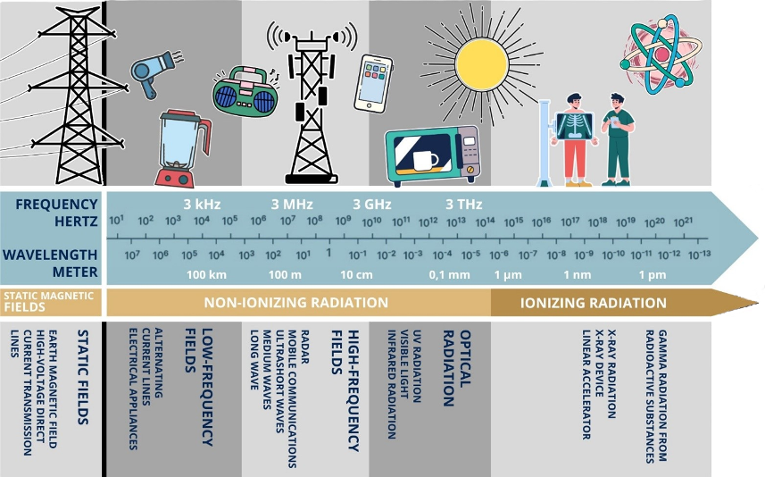 Figure 3: Frequencies and wavelengths of non-ionizing and ionizing radiation [10]