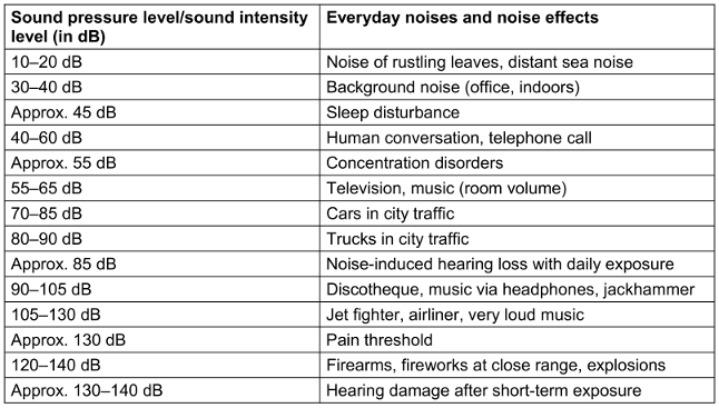 The hearing threshold for non-impaired hearing is at approximately 0 dB. The pain threshold is around 130–140 dB (Table 1 [Tab. 1]). The essential sources of environmental noise are traffic, industrial facilities and recreational noise. An overview of various environmental noise sources along with their sound intensity levels can be found in Table 1 [Tab. 1].