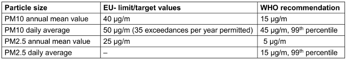 In response to the existing environmental epidemiological studies on the effect of PM on health, international and national guidelines have been developed [23], [24]. Currently, a guideline limit of 15 µg/m³ PM10 is established as an annual mean [24]. For PM2.5, there is a guideline limit of 5 µg/m³ as an annual mean. The EU limits, frequently discussed in public debates related to air quality management plans, are currently set at 40 µg/m³ for PM10 (annual mean) and 25 µg/m³ for PM2.5 (annual mean) (Table 2 [Tab. 2]). The principle from both the EU limits as well as the WHO guideline limits is that average values must be adhered and individual peaks should be limited. For this reason, daily average values have also been established, which may only be exceeded on a few days per year (Table 2 [Tab. 2]).