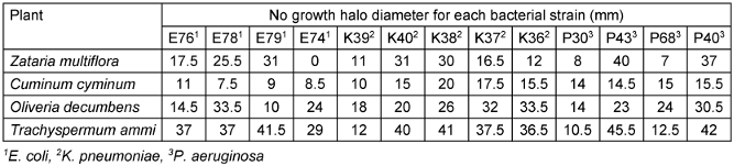 Table 2: Antibacterial effect of essential oils of Zataria multiflora, Cuminum cyminum, Oliveria decumbens and Trachyspermum ammi by disk diffusion method