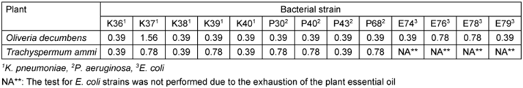 Table 3: Antibacterial effect of the essential oils of Oliveria decumbens and Trachyspermum ammi by MIC method (v/v)