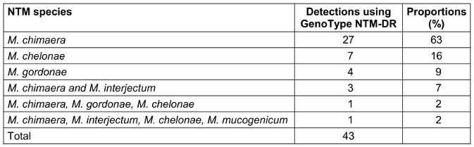A total of 43 NTM species were identified in 35 (83%) of 42 water samples (Table 1 [Tab. 1]). The most frequently detected NTM species was M. chimaera (n=27), followed by M. chelonae (n=7). Other identified NTM species included M. gordonae (n=4), M. interjectum (n=4), and M. mucogenicum (n=1).