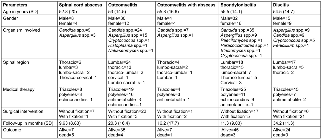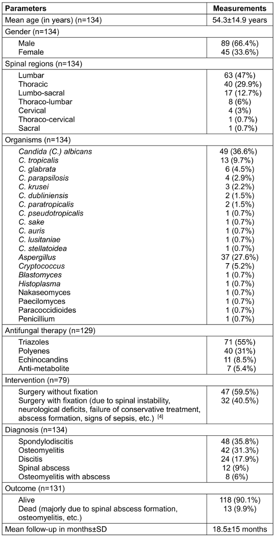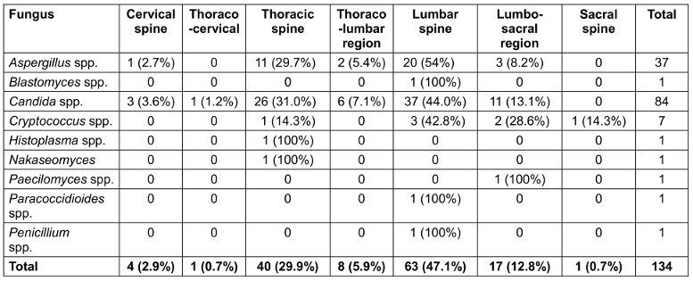 Results: Of the 134 analyzed patients, 66.4% were male. The mean age was 54.3±14.9 years. Most susceptible was the lumbar spine (47%), followed by the thoracic (29.9%) and lumbo-sacral (12.7%). The most common organism was Candida albicans (62.7%), followed by Aspergillus fumigatus (27.6%). Spondylodiscitis (35.8%) and osteomyelitis (31.3%) lead our review.