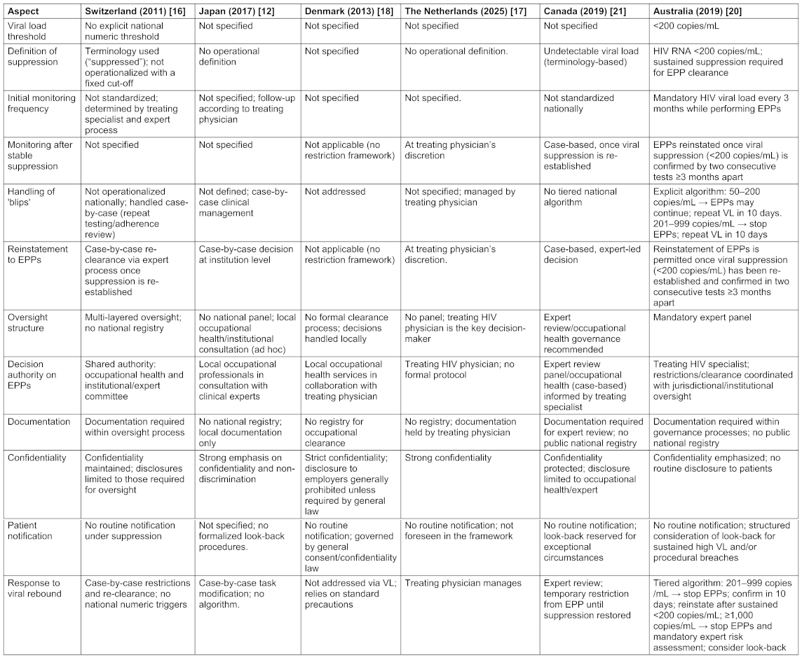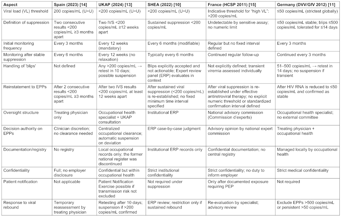 Results: The PubMed search yielded 2,851 records, but only three peer-reviewed recommendations met the inclusion criteria: the updated guidance of the Society for Healthcare Epidemiology of America (SHEA), USA; the recommendation of the German Association for the Control of Viral Diseases (DVV) and Society for Virology (GfV), Germany, and the consensus of the Japan Society for Occupational Health’s Research Group on Occupational Health for Health Care Workers. The manual search identified additional national guidance in the UK, Ireland, Canada, Australia, and several EU member states (including Switzerland, Austria, Denmark, the Netherlands, France, and Spain). Three major regulatory patterns emerged. First, multiple countries employ viral-load–based clearance for exposure-prone procedures (EPPs), most commonly using <200 copies/mL (UK, USA, Australia, Spain), while Germany applies the most stringent threshold (=50 copies/mL) with detailed “blip” rules and quarterly monitoring. Second, some jurisdictions adopt non-numerical, autonomy-oriented frameworks: the Netherlands relies on the treating physician’s responsibility under U=U without mandatory panels or reporting, while Denmark uses a universal infection-control approach that does not operationalize HIV status for practice restrictions. Japan similarly lacks numeric thresholds and formal oversight, delegating decisions locally while citing UK/US models as references. Third, Switzerland represents a conservative, procedure-heavy model without explicit thresholds, emphasizing external committee involvement and discretionary decision-making. Many other EU states show regulatory silence or only vague discretionary authority without HIV-specific operationalization.