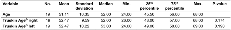 The Wilcoxon matched-pairs test conducted for the statistical comparison of the calendrical age with the Truskin Age® for the right and left sides revealed that the calculated Truskin Age® was slightly higher than the calendrical age (52.47 versus 51.11). However, the differences were not significant (p>0.05) at a p-value of 0.174 for the right side and 0.190 for the left side.