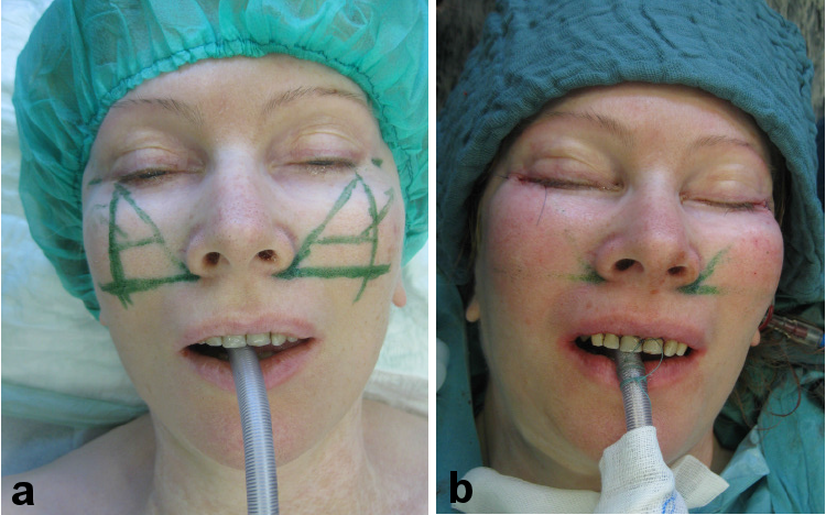 Figure 5: Pre-operative (a) and post-operative view (b) of a patient who underwent a subperiosteal centro-lateral midface lift using the transcutaneous suspension technique. Note the shortening distance of the lower lid.