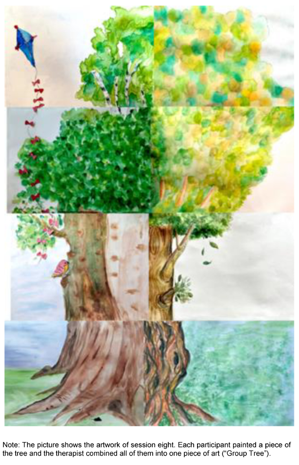 - The sixth session supported the togetherness as a group. The participants painted a “group tree” (see Figure 2 [Fig. 2]). Every participant painted one piece of the tree and the therapist combined the parts in one large piece of art.