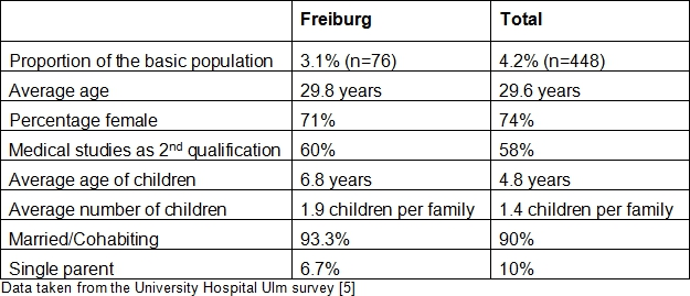Table 1: Statistical data on medical students with children in Freiburg in comparison with the survey totals