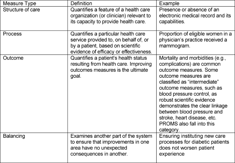 Performance measures “are designed to measure systems of care and are derived from clinical or practice guidelines. Data that are defined into specific measurable elements provides an organization with a meter to measure the quality of its care.” [31]. Performance measures typically fall into four main categories (see Table 1 [Tab. 1]) [32], [31]. In addition to patient experience measures, measurement and assessment of clinical performance is now an essential component of both quality assurance and improvement efforts and will need to increasingly find their way into health professions training. One method to assess clinical performance in addition to direct observation, patient surveys and MSF is review, or audit, of the medical record [33]. Medical records serve a number of important functions: