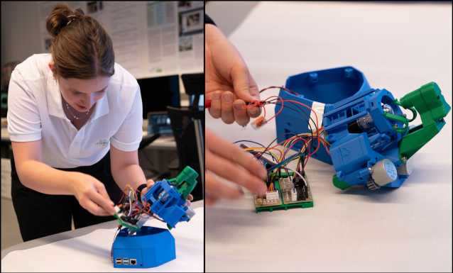 Figure 2: A student assembling the microscope (left) and organizing the hardware inside (right)