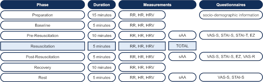 Cardiac reactivity (CR), defined as the difference between the mean heart rate during resuscitation and a baseline period before resuscitation, was used as the primary objective measure of objective stress perception. For this purpose, continuous electrocardiography was performed using the Holter ECG medilog AR12plus (SCHILLER Medizintechnik GmbH, Obfelden, Switzerland). Using the medilog DARWIN2 software (SCHILLER Medizintechnik GmbH), electrical cardiac activity was automatically detected via three leads, verified, and incorrectly detected cardiac activity was manually corrected. The secondary outcome measure of objective stress perception was the heart rate (HR) and the heart rate variability (HRV) parameters SDNN (Standard Deviation of NN intervals), SNS Index (Sympathetic Nervous System Index), SI (Stress Index) and SD2 (Standard Deviation of the distances of the points from the major axis) during resuscitation. HRV analysis was performed using the Kubios HRV version 2.0 software (Biosignal Analysis and Medical Imaging Group, University of Kuopio, Finland). Respiratory rate (RR) was also used as a secondary outcome measure immediately after resuscitation and was continuously recorded by the Vernier Go Direct Respiratory Belt and analyzed using Vernier Graphical Analysis™ 4 software. Finally, the ratio of salivary alpha-amylase activity (sAA) immediately after resuscitation to a resting value before resuscitation was considered as another secondary outcome measure of objective stress perception. For this purpose, three saliva samples were collected from the subjects using saliva cups (SARSTEDT). The participants were instructed to place the saliva collection device's absorbent roll in one of their cheeks for two minutes without chewing or speaking [21], [22], [23]. After being stored at -20°C for a maximum of three days, the samples were subjected to automated in-vitro testing using the Roche Cobas6000 [23], [24], [25]. The samples were thawed at room temperature and centrifuged at 4000 revolutions per minute for ten minutes at room temperature. 10 μl of the sample were mixed with 990 μl of distilled water. After calibrating the measurement system with distilled water and a Roche calibration standard, the measurement was started using the c501 module in serum mode [24]. The Roche cobas c systems automatically calculate the analytical activity of the sample [24]. The conversion factor was: U/Lx0.0167=μkat/L. The kinetic method is based on the cleavage of 4,6-ethylidene-(G7)-1,4-nitrophenyl-(G1)-α,D-maltoheptaoside (Ethylidene Protected Substrate=EPS) by alpha-amylase, followed by the hydrolysis of all cleavage products using alpha-glucosidase (auxiliary enzyme) to p-nitrophenol (100% chromophore release) [24]. The color intensity of the formed p-nitrophenol was directly proportional to the alpha-amylase activity and was determined by measuring the increase in extinction [24].