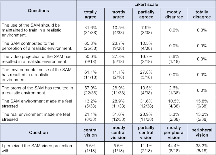 To investigate whether the goal of a realistic representation of the environment is achieved by the SAM and whether the SAM has an influence on the perception of stress the SAM was evaluated in a pilot study during two courses on polytrauma care at the Magdeburg Training Center for Basic Medical Skills (MAMBA Skillslab). Two simulation scenarios were performed in SAM environments and two simulation scenarios were performed in real-world environments not represented by the SAM. The SAM simulated a scene in a forest and a scene on a busy road. A stairwell and a street in front of the training center served as real environments. In all the simulations, participants had to care for a Laerdal Resusci Anne QCPR full body with airway head in a polytrauma scenario. Following the scenarios, all participants completed a questionnaire consisting of eight questions using Likert scales (see table 2 [Tab. 2]). Three questions were only added in the second course.