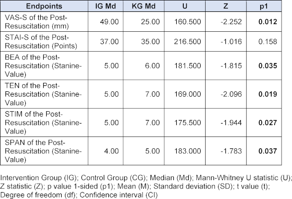 A priori power analysis was conducted using G*Power 3: Statistical Power Analyses from Heinrich-Heine-University Düsseldorf based on a study by Mills et al. on the effects of emergency medical high- and low-fidelity simulations on cardiac reactivity [29]. To obtain statistically significant results regarding cardiac reactivity as the primary target of objective stress perception, a total sample of 38 participants would have been necessary based on these calculations. The participants were randomized into the intervention and control group using the RITA software (Randomization In Treatment Arms, StatSol, Lübeck) prior to the start of the trial. The statistical analysis was performed with the assistance of the Institute of Biometry and Medical Informatics using IBM SPSS Statistics 29 software (IBM, Ehningen, Germany). Descriptive analyses of the variables under investigation were conducted initially. The data was tested for normal distribution using the Shapiro-Wilk test. If the parameters were normally distributed, the Welch test was chosen as the metric test procedure. If the parameters did not follow a normal distribution, the Mann-Whitney U test was used as a non-parametric test. The distribution was tested using the Kolmogorov-Smirnov test for two samples after standardizing the data. The effect size was determined using Cohen’s d for metric methods and Pearson’s correlation coefficient r for non-metric methods.