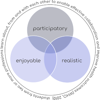 SHAPED develops its IP learning activities based on the three quality attributes displayed in figure 1 [Fig. 1] and by following the aforementioned best practices for IPE [16], [18]. The quality attributes were derived from a position paper on IPE based in literature and student-expert opinions of the collaborating seven Swiss healthcare students’ associations [26]. This position paper emphasizes that from a student perspective, “good” IPE activities should be participatory (i.e. students should actively participate in the activity) and realistic (i.e. activities should reflect real life scenarios, if possible). These conditions are in line with situated and experiential learning often described in IPE literature [27] and match recommendations by Maddock et al. [16]. Furthermore, there is evidence that fun and enjoyment benefit adult learning [28], resulting in enjoyable (i.e. having fun during IP courses and thus enhancing engagement and motivation to learn) becoming the third quality attribute to guide the development of SHAPED’s IPE activities.