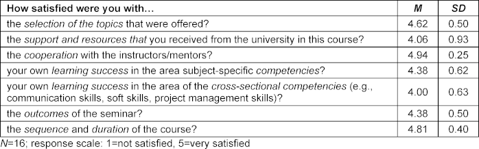 Overall, 19 students attended the seminar in the 2022/23 winter semester. At the end of the seminar during the last session, the participants who were present (N=16, age: M=26.5, SD=2.83 years; sex: female n=13) were asked to fill out a course evaluation. The participants were satisfied or very satisfied with the seminar in regard to all of the evaluation items (see table 1 [Tab. 1]). They expressed a high level of satisfaction with the choice of topics (M=4.62; SD=0.50) and cooperation with the instructors (M=4.94; SD=0.25). Satisfaction was lowest with the support provided by the university (M=4.06; SD=0.93) and their self-assessed gain in cross-sectional competencies (M=4.00; SD=0.63).