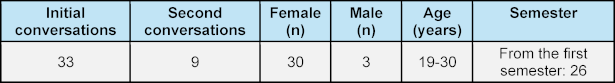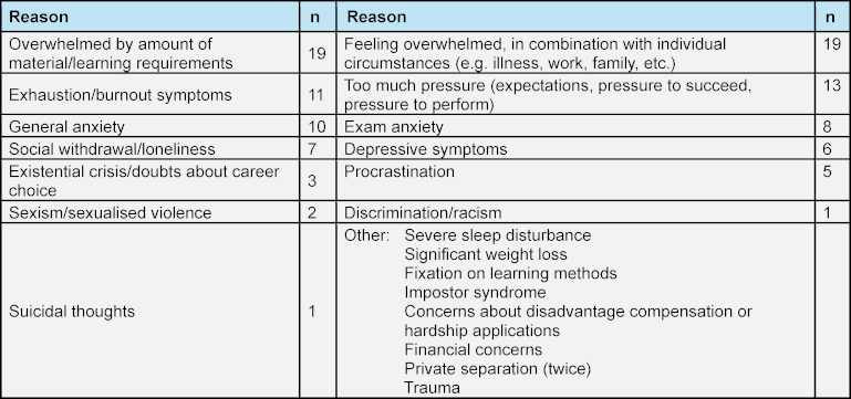 Regular requests for meetings have been received – albeit hesitantly – particularly during the first weeks of medical studies. In most cases, one meeting is sufficient to restore the student’s confidence and help them regain self-efficacy. However the option of a second conversation is rarely taken up immediately but is instead kept as a “backup”, according to the students themselves, in case of a another deterioration in mental well-being. The duration of conversations varies between 20 and 90 minutes. Contact with peers is established via a dedicated email address, by telephone or in person. Initial feedback is provided within 24 hours, and a meeting is offered within 48 hours of contact (see table 1 [Tab. 1] and table 2 [Tab. 2]).
