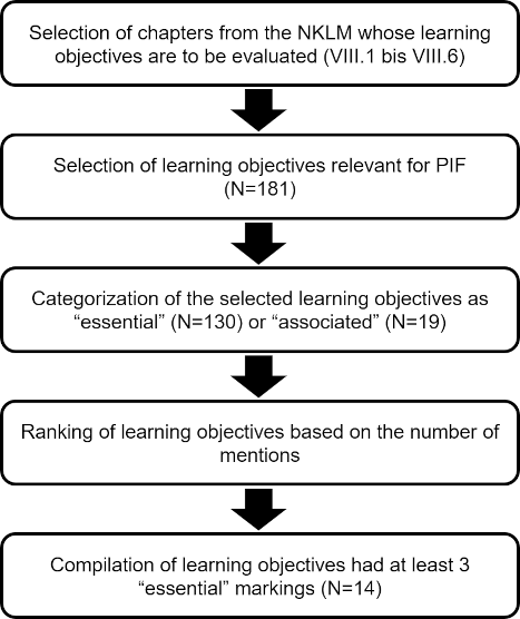 The learning objectives of the selected NKLM chapters (N=532) were made available to all members of the working group in an workable format (Excel file). First, each of the individual experts (N=6) selected from these 532 learning objectives those that they considered to be fundamentally relevant to PIF. The individually selected learning objectives were compiled in another Excel spreadsheet. This resulted in a collection of learning objectives (N=181) that the experts considered relevant to PIF in general.