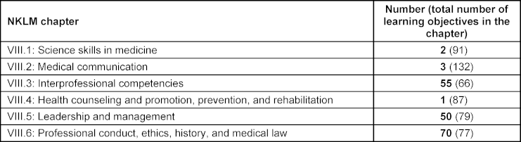Table 1: Number of learning objectives classified as relevant in the National Competency-Based Catalog of Learning Objectives for Medicine (NKLM, version 2.0) for the higher-order competencies for medical education (chapters VIII.1 to VIII.6).