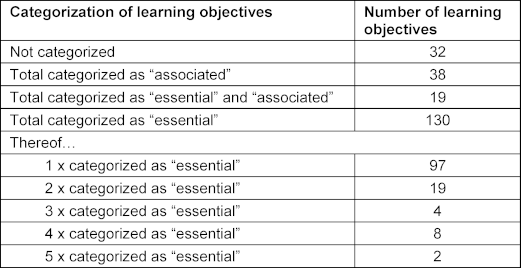 The evaluations from this second round, in which six experts participated again, were summarized and compiled in a file (see attachment 1 [Att. 1]). All of the learning objectives mentioned are listed there with the number of mentions (see 2.2), the number of “essential” markings, and the number of “associated” markings. Learning objectives that were neither rated as “essential” nor “associated” were not processed any further.
