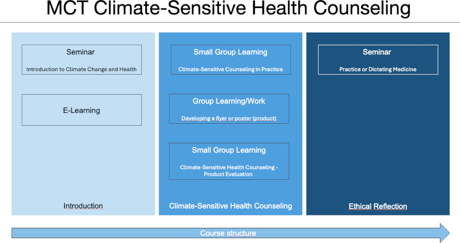 Results: The MCT CSHC was implemented from 2023 onwards. All characteristics of high-quality planetary health education, were incorporated into the MCT, with particular emphasis on developing transformative competencies, such as the ability to communicate in a climate-sensitive manner. The teaching materials were made publicly available. The MCT CSHC was further developed based on student and instructor feedback.