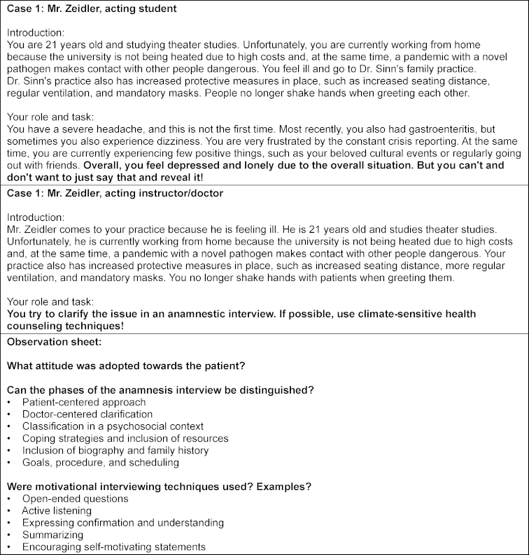 In the small group format “climate-sensitive counseling in practice” (chair of general medicine, two sessions of 45 minutes), the social format alternates between plenary lectures and interactive sessions. Interactive work is carried out in conversation simulations and discussion rounds. The knowledge acquired so far is reflected upon, students’ prior experiences are discussed, and potential pitfalls of CSHC in general practice are highlighted. The instructors can share tips and experiences from their own daily practice. Furthermore, communication skills focused on motivational interviewing are practiced through role-playing exercises (e.g., the case vignette in figure 3 [Fig. 3]). This also targets the ability to structure conversations, which is vital for CSHC. After a reflection on the sessions, the group work phase concludes with instructions for developing the product. Important learning objectives of these sessions include the ability to describe the concept of Planetary Health and to formulate co-benefits. It also aims to improve motivational interviewing skills.