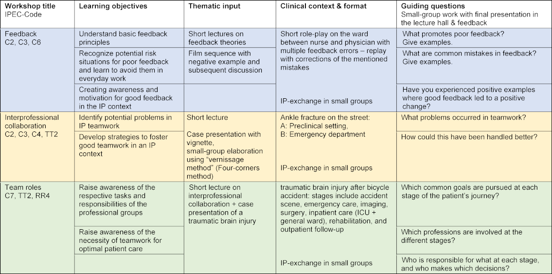 Table 2: Overview of the 3 iInterprofessional (IP) workshops at Komm2gether (n=108 per session)