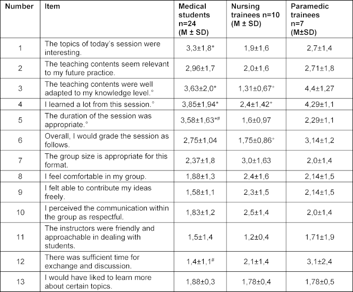 Methods: The target groups were medical students (MS; n=168), nursing trainees (NT; n=30), and paramedic trainees (PT; n=28). The course focused on role clarification and communication and was delivered using simulation-based training scenarios (IP feedback, team communication, and handover). A comprehensive evaluation was performed using a Likert scale (1-6; 1=I agree, 6=I disagree; mean±SD).