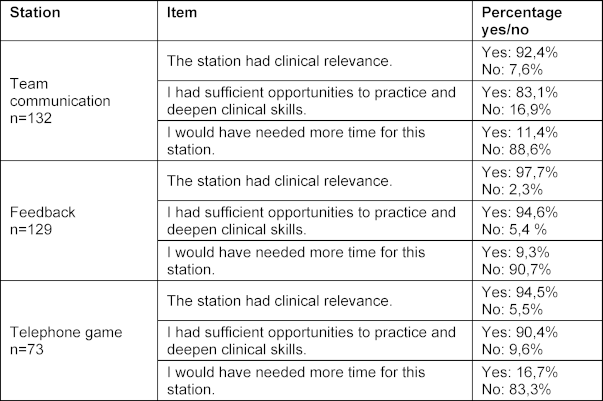 In the quantitative analysis, a consistent pattern was observed across all three stations (see table 4 [Tab. 4]). All stations were rated as clinically relevant, and participants reported sufficient opportunities for practice.