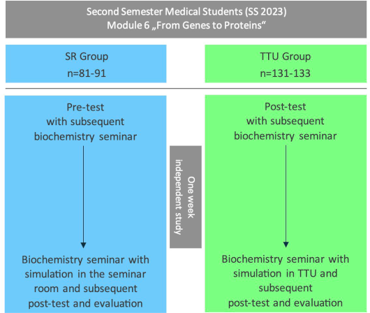 Comparison of the two study groups of the integrated seminar “From Gene to Protein,” in which second-semester medical students were randomly assigned during the summer semester of 2023 as part of the regular seminar planning of the Ulm Medical Faculty. The seminar room group (SR group, control group) completed the entire seminar, including the simulation, in a conventional seminar room. The students in the TTU group (intervention group), on the other hand, carried out the simulation at the Ulm Training Hospital (TTU), while the rest of the seminar was taught in the seminar room as well. The pre-test was taken at the beginning of the first seminar session, and the post-test and evaluation at the end of the second seminar session. There was a one-week interval between the two sessions. In the SR group, 81 students completed the pre- and post-tests, and in the TTU group, 131 students. A total of 91 students from the SR group and 133 students from the TTU group participated in the evaluation.