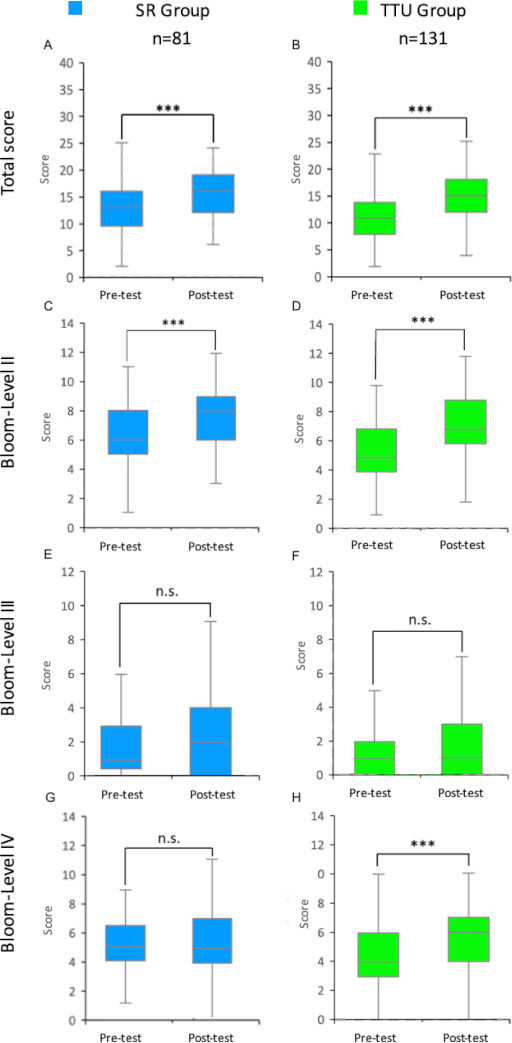 The comparison of the pre- and post-test results showed that both the SR group (n=81, p<0.001, r=0.44, Mdpre=13, Mdpost=16) and the TTU group (n=131, p<0.001, r=0.55, Mdpre=11, Mdpost=15) achieved a significant total score increase.