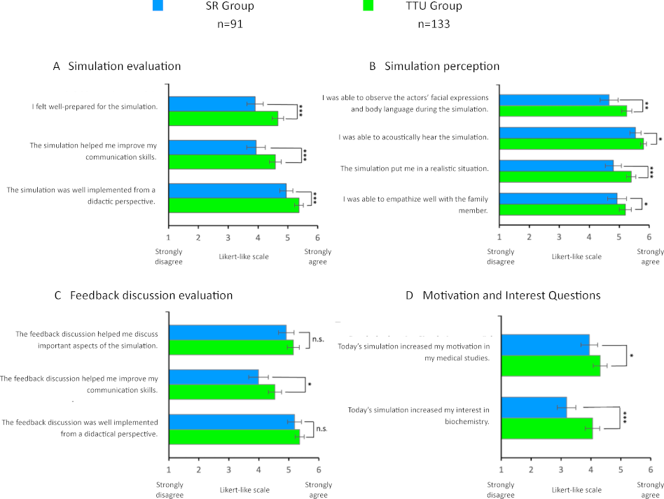 Before the respective simulation, both groups were comparably motivated (“Before today's simulation, my motivation in my medical studies was high”, SR group: n=91, M=4.78, SD=1.08; TTU group: n=133, M=4.9, SD=1.09) and interested (“Before today's simulation, my interest in biochemistry was high”, SR group: n=91, M=3.36, SD=1.49; TTU group: n=133, M=3.29, SD=1.31).