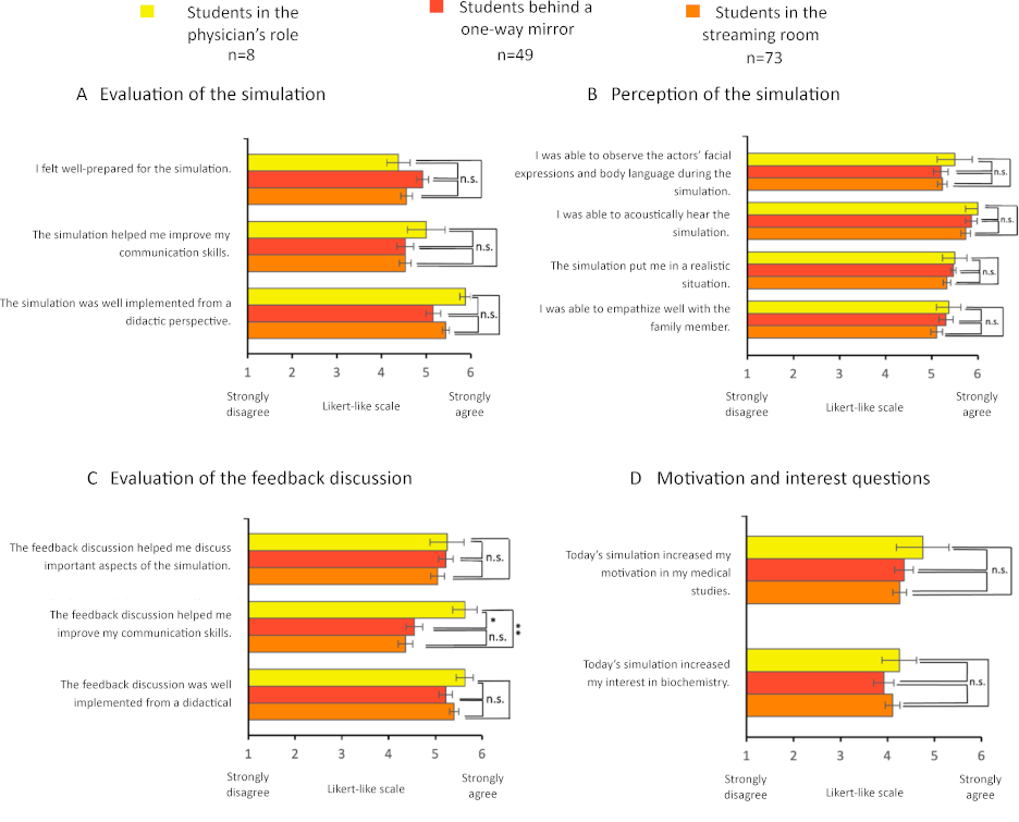 With regard to the motivation in medical studies, there was no significant difference between the subgroups before the interview (“Before today’s simulation, my motivation in my medical studies was high”, physician’s role: n=8, M=5.5, SD=0.54; behind the mirror: n=49, M=4.88, SD=1.11; streaming room: n=73, M=4.84, SD=1.12). There were significantly different levels of agreement with the interest in biochemistry before the simulation (“Before today’s simulation, my interest in biochemistry was high”, physician’s role: n=8, M=4.25, SD=1.04; behind the mirror: n=49, M=3.20, SD=1.21; streaming room: n=73, M=3.23, SD=1.36). The significance levels were reached in between the students in the physician’s role and those in the streaming room (p<0.05), as well in between the students in the physician’s role and those behind the mirror (p<0.05).