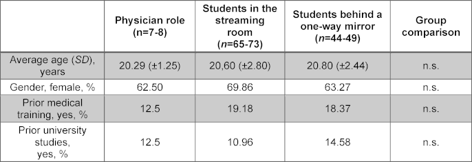 The seminar groups were each divided into three subgroups, two groups of physicians and one group of observers. One volunteer from the physicians’ groups took on the role of a physician and was briefed by the other members of the physicians’ group. For the simulated session, the physician and the patient’s family member sat at the same table. The students from the observer group observed the simulated session from the back in the same room without any technical observation elements. After the simulated session, the students received structured feedback in a group discussion, which was led by the respective lecturers [12], [13], [14], [15], [16], [17].