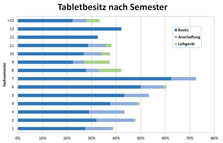 Interessant ist die Verteilung der Tabletbesitzer nach Semestern (Abbildung 1 [Abb. 1]). Im 7. Semester gab es ein Maximum mit 72% – also besaßen fast drei Viertel ein Tablet oder wollten sich eins kaufen. In den höheren Semestern fiel dieser Wert abrupt auf 38% ± 5% ab. Diese dichotome Verteilung könnte auf den folgenden Mustern beruhen: