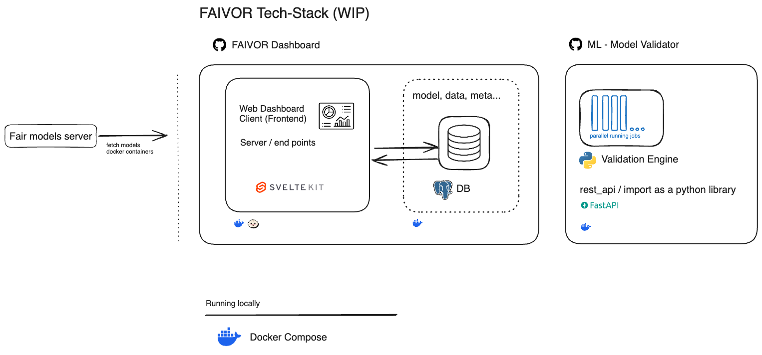 The FAIVOR tool is an on-premises system for evaluating and adapting pretrained medical machine learning models to new datasets. The tool encompasses the following architecture (Figure 1 [Fig. 1]) (https://github.com/MaastrichtU-BISS/FAIRmodels-validator).
