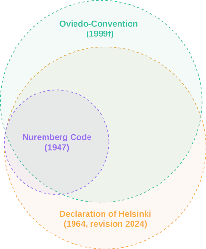 Figure 1: Venn diagram illustrating the overlaps between the Oviedo Convention, the Nuremberg Code, and the Declaration of Helsinki; schematic, not quantitative (cf. Table 2). The Nuremberg Code ultimately served not only as a reference point for the first version of the DoH (1964), but also for the Oviedo Convention (1999), which is also discussed in the context of the DoH [9]. The 2024 version of the Declaration of Helsinki represents a significant further development of ethical standards for medical research. It expands the scope of responsibility, strengthens the rights and protection of participants, and integrates contemporary ethical considerations on sustainability and scientific integrity. These changes are intended to ensure that medical research is ethical, participant-centered, and beneficial to society while adhering to rigorous scientific standards.