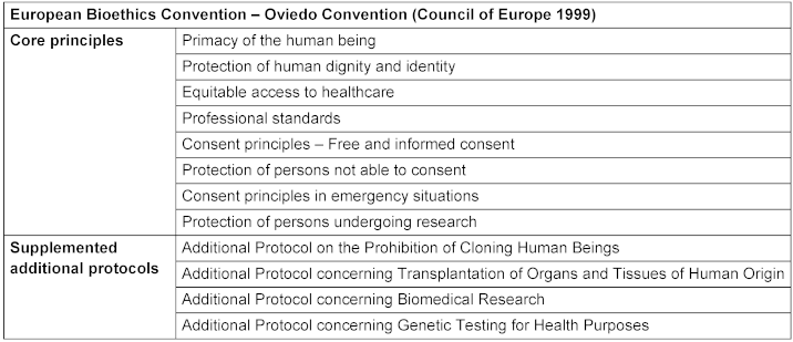 Table 1: As the only international legally binding instrument on the protection of human rights in the biomedical field, the Oviedo Convention [10] establishes fundamental principles to safeguard human dignity in the rapidly evolving domains of biology and medicine. Through these principles, the Oviedo Convention aims to ensure that developments in biomedicine benefit future generations and all of humanity while protecting fundamental human rights and dignity in this rapidly evolving field.