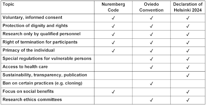 Table 2: Intersections and differences of some principals (see Figure 1: Venn diagram) of Helsinki (DoH 2024), Oviedo (1999) and Nuremberg Code (1947). All three declarations share the principles of voluntary, informed consent, the primacy of the individual, the protection of dignity and rights, the qualification of researchers and the right to withdraw from participation. Nuremberg and Helsinki focus on social benefits. The Oviedo Convention and the Declaration of Helsinki particularly concern dealing with vulnerability, equitable healthcare, and the role of ethics committees.