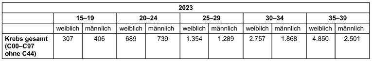 Tabelle 1: Krebsinzidenz im Jahr 2023 bei Jugendlichen und jungen Erwachsenen (15–39 Jahre). Datenbankabfrage beim Zentrum für Krebsregisterdaten (ZfKD) [3].